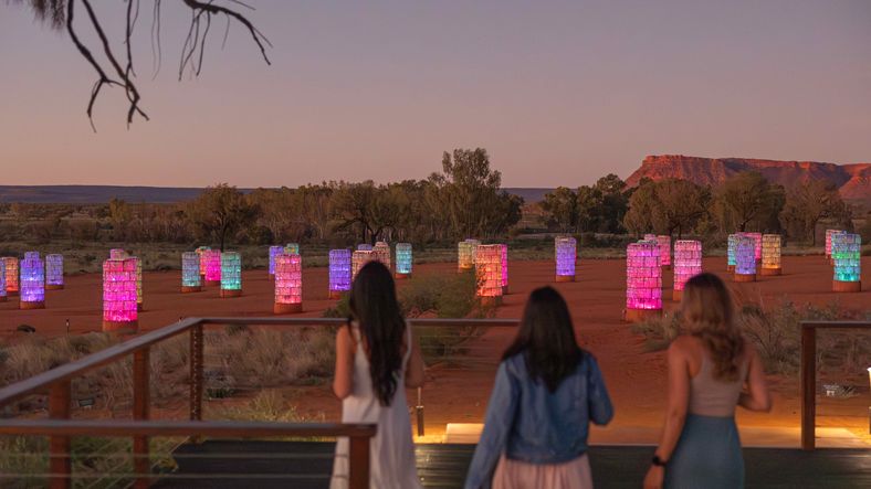 As evening rolls in, experience the desert sunset at the Uluṟu sunset viewing area - watch the colours of the rock shift from deep red to burnt orange or purchase a Field of Light star pass and wander through the desert illuminated by thousands of softly glowing lights